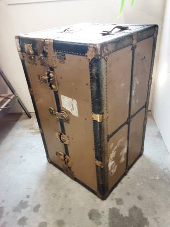 Large H &M travel trunk with four drawers and ironing board. I used it as a dresser in a guest room. Would work well to display other antiques. Front lock does not work, no key available....