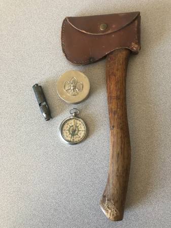 BOY SCOUT PLUMB AXE With Leather Cover; And A Girl Scout Fold Out Cup, With Lid; And A Scout Whistle; Girl Scout Compass; All Have Nice Stampings; All 4 For $140. 406-599-36 four five