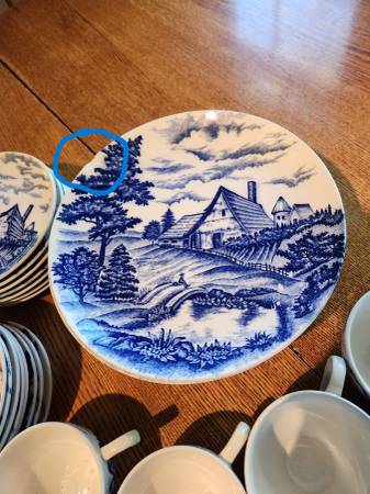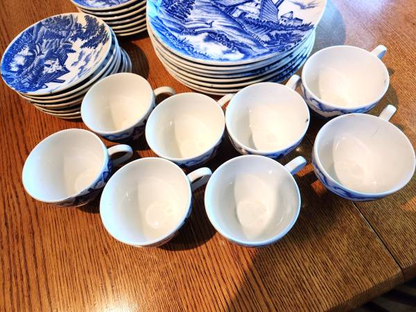 I have this set of blue and white dishes for sale. The set was made in Japan and I believe it comes from the 1940s-1950s. Included are 8 dinner plates, 8 cups, 8 saucers, and 7 bread and butter plates. The set has a few flaws such as random slight rough spots, stray spots of blue glaze on a couple of cups, tiny black dots in the bottom of a cup, etc. These are all from the making process. In additon, there is what looks like a small hairline crack inside one cup and a large chip on the edge of one dinner plate. Overall this is a nice set of dishes, especially for being over 70-80 years old. Please email if you are interested, have questions, or would like more photos.