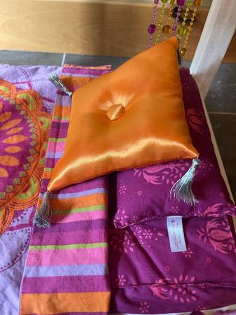 - Bright orange satin throw pillow. Gold tassels in each corner.