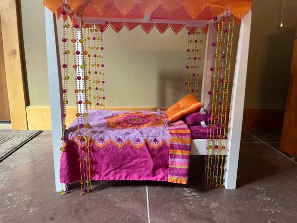 Julie’s bed is a fun, playful feel with the bright colors, canopy and beads on all four bedposts.