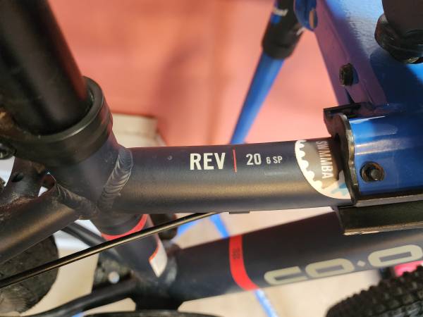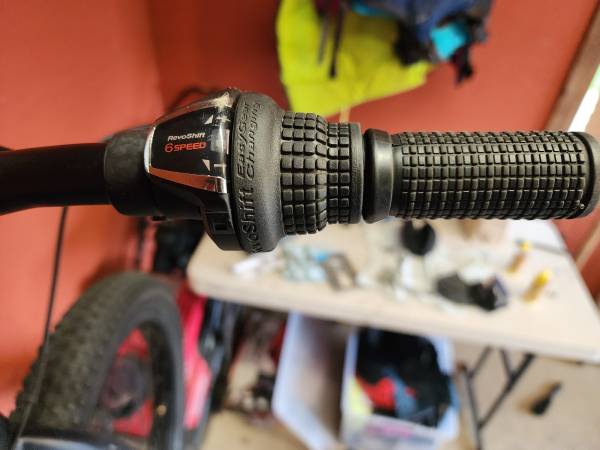 Aluminum; 20" (wheel size) kids mountain bike; 6 speed (1x6) grip shift; mechanical disc brakes; good tires with some life left in them.
