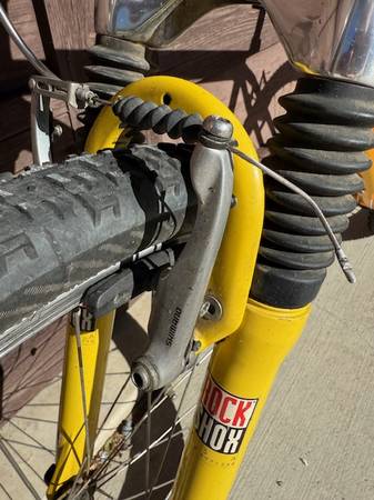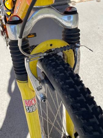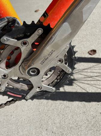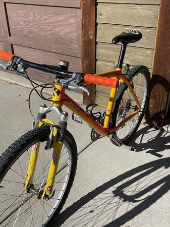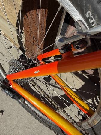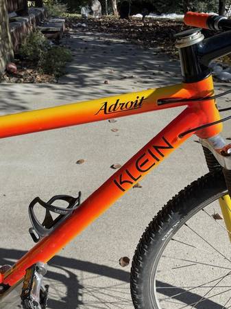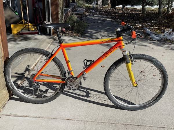 Classic Klein, their top-end hardtail frame, beautiful sunset linear fade (or Koi?) paint job. Klein was famous for debossing instead of using decals. 26" wheels. Mostly original except grips (my son wanted orange). RockShox Judy SL fork, Shimano Deore LX components, original one-piece Klein headset/bars. Headset cap is missing but should be easy to find/replace. Thompson Elite seat post, 31.6. Frame is in fine shape with a few scratches but nothing major; I tried to show them in pix. Size c-t 17", top tube c-c 22". Crank arms 175 mm. I believe the serial number makes this an April 1996 model, 10th made that year (the first few letters/numbers are hard to make out). It was manufactured as a true Klein (before Trek changed things and started rebadging Attitudes as Adroits), 2" downtube etc.