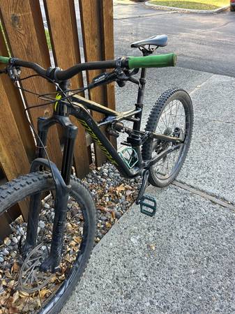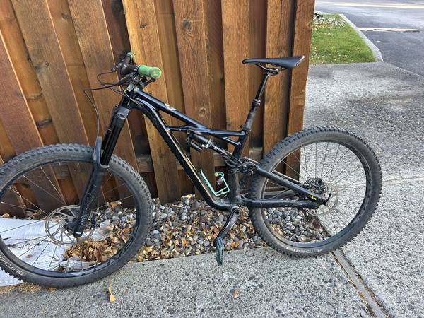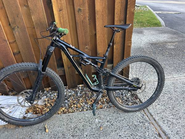 This is a size small Specialized Enduro 2018. It is black with green handles and blue pedals. It has been well used but is in very good condition. The only issue is that the dropper post gets a little sticky. It has no problem going down but needs some help coming up sometimes. Otherwise, bike is in great condition and is fun to ride.