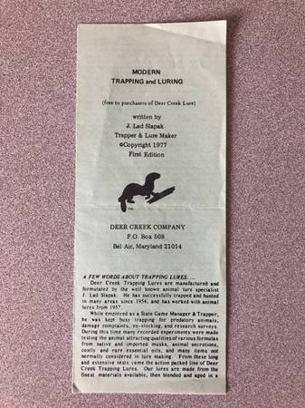 J. Lad Slapak; Trapper and Lure Maker; 1977; First Edition; 4 page brochure $10.