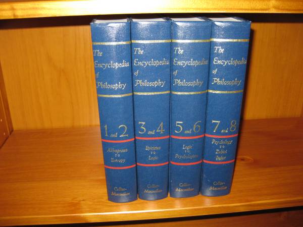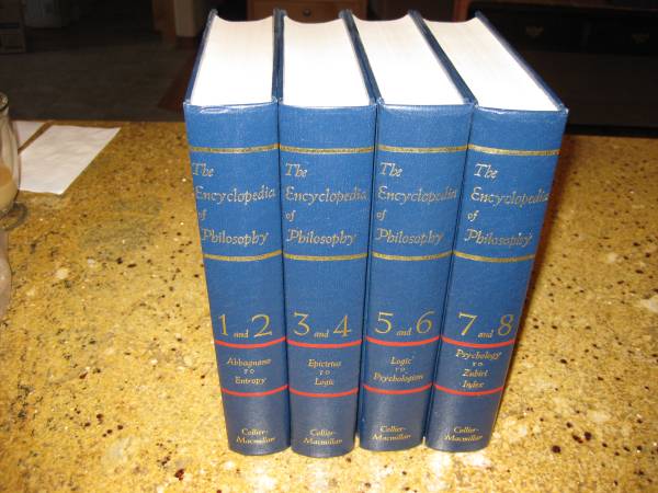 This 4-volume set contains volumes 1 through 8 of The Encyclopedia of Philosophy, published by Collier-Macmillan in 1972. It is in like-new condition with no marks or damage. It is an extraordinary and comprehensive reference work for those who are interested in or would like to learn about philosophy.