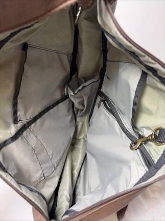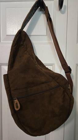 USED: AmeriBag 17" Brown Espresso Suede Leather Healthy Back Bag Tote is a stylish and functional shoulder sling bag with a tear-shaped design. This bag features a zip closure and a variety of pockets, both outer and inner, for organization. The adjustable crossbody strap offers hands-free convenience, making it perfect for travel, casual outings, workwear, or business purposes.