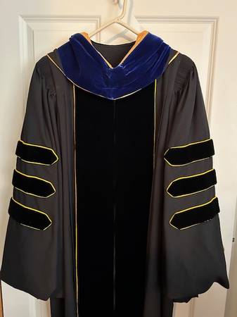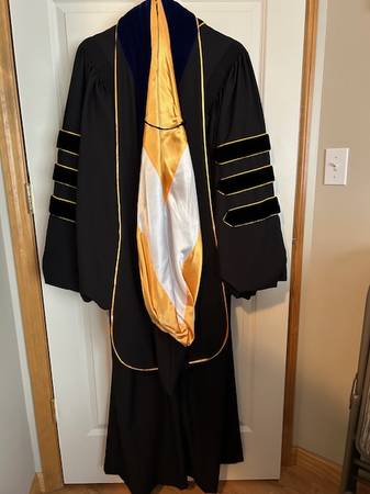 The hood is highlighted in the dark blue velvet representative of universal PhD standing NOT a particular academic subject. The satin in the hood is yellow and white, which may be appropriate for MSU graduates. The regalia comes with a six sided tam with the traditional burnished two button gold tassel also indicative of PhD status.