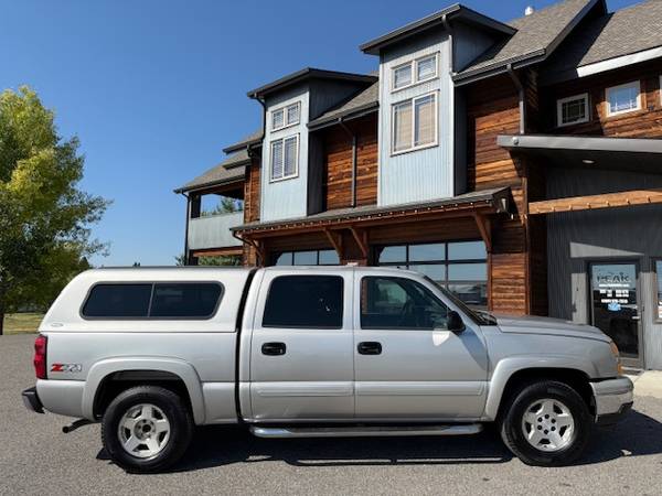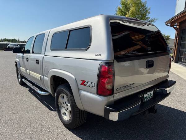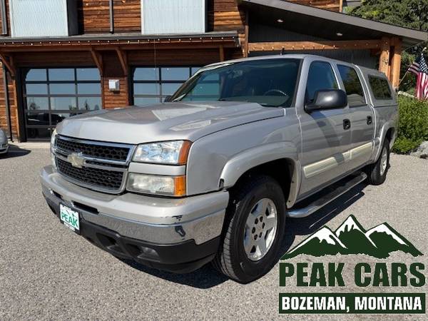 This is a 2006 Chevrolet Silverado 1500 half-ton LT crew cab 1500 4x4 with the 5.3L Vortec 8-cylinder gas engine and an automatic transmission. It has 217,000 miles. It is Silver Birch with dark gray leather interior. It has heated seats, BOSE factory BOSE CD player, fiberglass SnugTop topper, power windows, power locks, power driver's seat, cruise control, air-conditioning, 5.5ft rhino-lined bed, nerf bar running boards, Class III tow package and rear tinted windows. It has a nearly new set of Michelin all-season tires and all new ball joints. Alot of recent maintenance. This Silverado is from Montana and has been non-smoker owned and well maintained. CARFAX guaranteed, professionally serviced and detailed. $8900 (406) 570-7379 VIEW ALL OF OUR INVENTORY @ WWW.PEAKCARS.COM