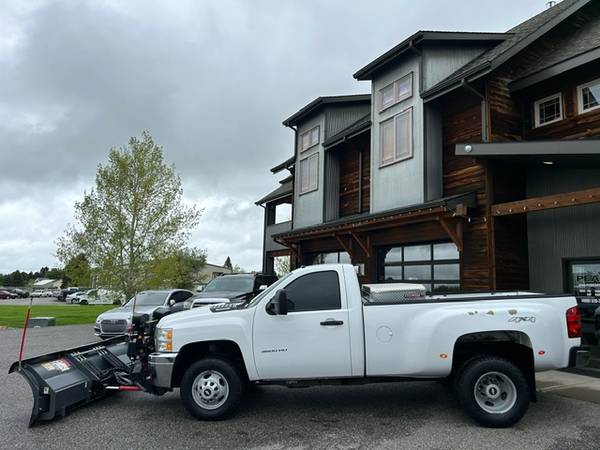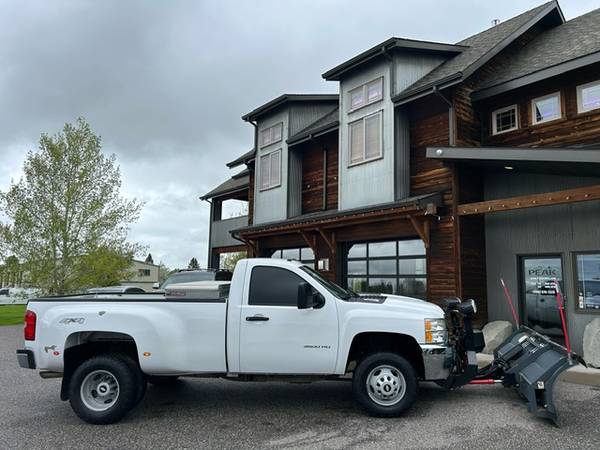 This is a 2013 Chevrolet Silverado 3500HD 4x4 with the 6.0L Vortec 8-cylinder engine and a 6-speed automatic transmission. It is bright white with charcoal cloth interior. This Silverado only has 31,000 miles. It has the 8-foot box, cruise control, air conditioning, factory stereo/CD, chrome bumpers, factory steel wheels with nice Cooper Discoverer AT3 LT tires, Weatherguard tool box, privacy glass, cab lights, and vinyl floors. This Silverado is a local 2-owner that spent most of its life (untill 2022) in southern California and then Bozeman the last 3 years. It was a back-up snow plow for a local business though was primarily used as a utility truck in the summer. This 3500 comes with a SNOW EX adjustable wing box style power plow. CARFAX guaranteed, professionally serviced and detailed. $33900 Ryan or Matt (406) 570-7379 VIEW ALL OF OUR INVENTORY @ WWW.PEAKCARS.COM