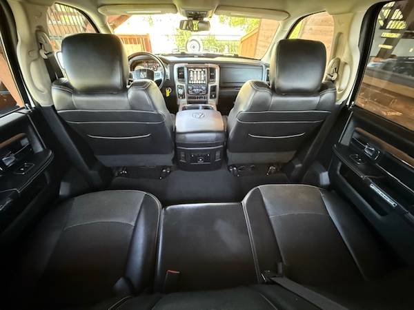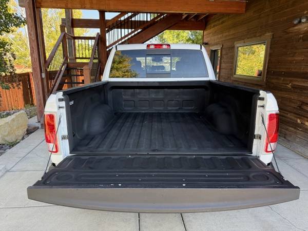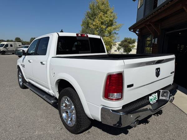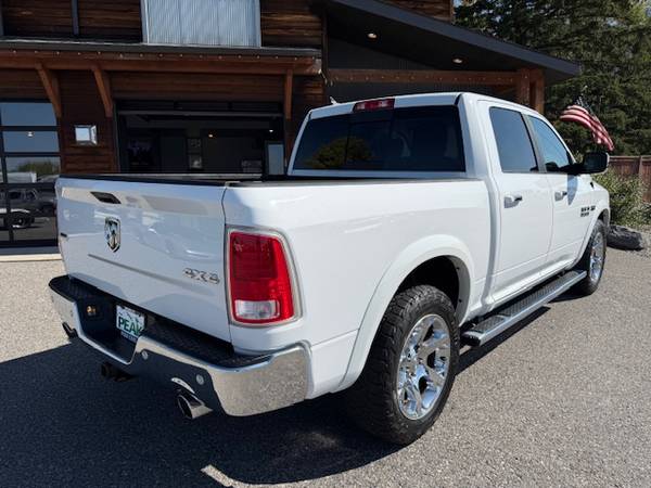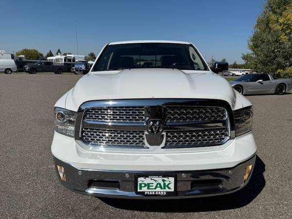 This is a 2017 Ram 1500 Laramie Crew Cab 4x4 pickup with the 5.7L Hemi gas engine and an 8-speed automatic transmission. It is Bright White Clearcoat in color with black leather interior. This truck has 104,000 miles. It has all power options including heated/ cooled leather bucket seats, heated steering wheel, heated second row seats, power rear glass window, 8.4 inch UConnect touch screen radio/XM with navigation, Alpine amplified stereo with factory subwoofer, LED bed lighting, front and rear parking sensors, chrome side steps and factory 20" chrome wheels with nice Nitto Recon Grappler all-terrain tires. This Ram is a 1-owner truck from San Juan Capistrano California that has been well maintained and has been non smoker owned. CARFAX guaranteed, professionally serviced and detailed. $26900 Call Matt or Anthony (406) 570-7379 VIEW ALL OF OUR INVENTORY @ WWW.PEAKCARS.COM
