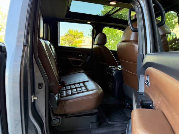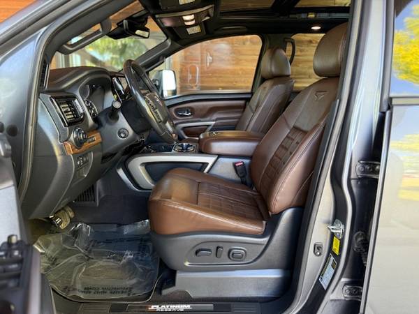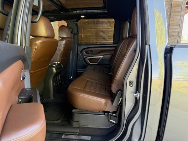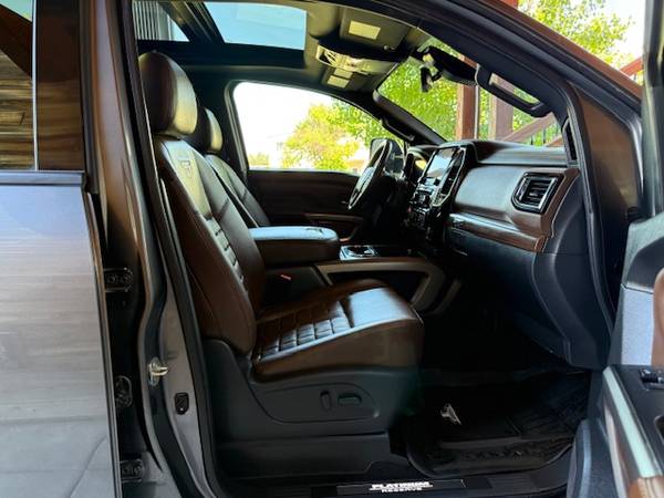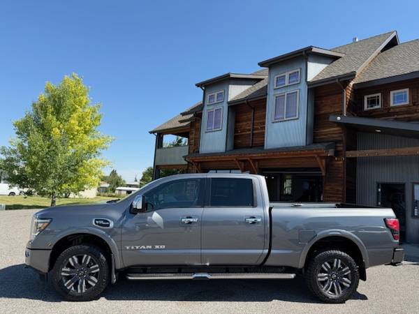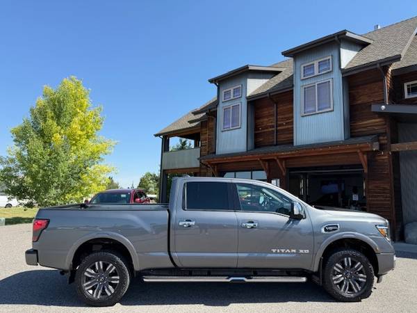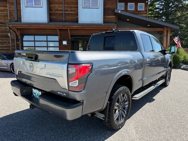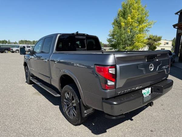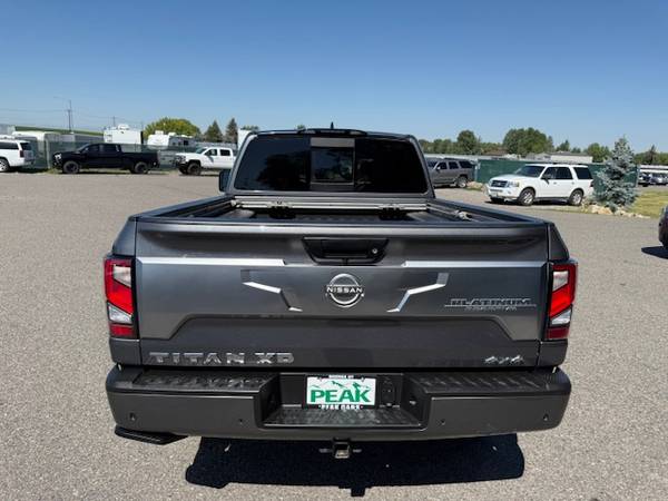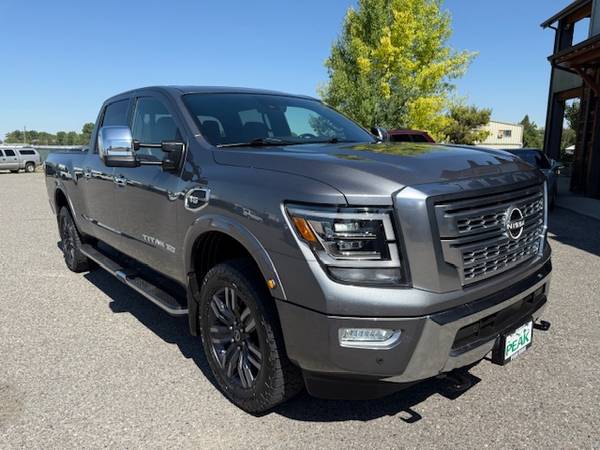 This is a 2023 Nissan Titan XD Platinum Reserve 4x4 crew cab pickup with the 5.6L 400HP 8-cylinder gas engine and a 9-speed automatic transmission. It is gun metallic gray with brown leather interior and has 54,000 miles. This Titan has all power options including heated and cooled leather seats, Fender premium stereo/CD with amplified factory subwoofer, 9-inch touchscreen with navigation, 20-inch factory dark clad wheels with nice Falken Wild Peak AT tires, tow package, Platinum utility box, rear bed step, electronic locking tailgate, dual pane moonroof, bed-liner, back-up sensors, power rear window, running boards, bluetooth, 120V bed outlet, integrated trailer brake, heated mirrors, LED lights, heated rear seats and tow package. This truck is very powerful and is fun to drive. It is rated for 15 mpg city and 20mpg highway. This Titan is a local one-owner that has been well maintained. Full factory warranty remaining. CARFAX guaranteed, professionally serviced and detailed. $41900 Call Matt or Anthony @ (406) 570-7379 VIEW ALL OF OUR INVENTORY @ http://WWW.PEAKCARS.COM