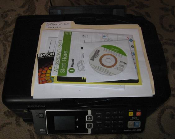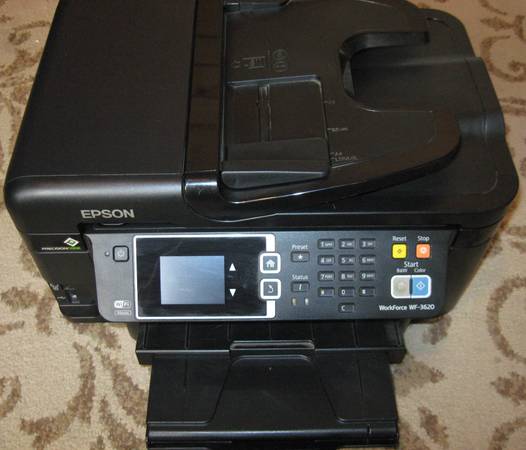 Epson Workforce WF 3620 Printer. Copy,scan, fax double-sided directly from control panel. Wireless from smartphone, tablet, or computer. Works great. New $169.99. Used- so low on ink. Will need new ink cartridges. Epson 252 XL black /252 color cartridges.