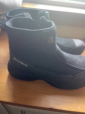 Black. Mens Size 10 studded snow boots. (But I’m a woman fyi) I wore them just 2 times. Really great condition, Like new! Great in icy conditions! I just don’t go out as much in the winter to justify using these. Retails for $200 at Scheels.