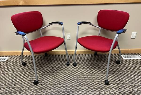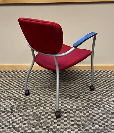 4-8) High End Red Global Caprice Modern Armchairs with Casters: Comfortable, quality chairs that roll smoothly. Overall dimensions (including legs) are 25″ wide x 24.5″ deep x 18″ seat height and 32.5″ back height. Dimensions of the seat are 20″ wide x 19″ deep. (These cost $642 EACH new.) Four (4) available. These were $250 each . . . REDUCED to $195 each! Will sell in sets of 2 or all 4.