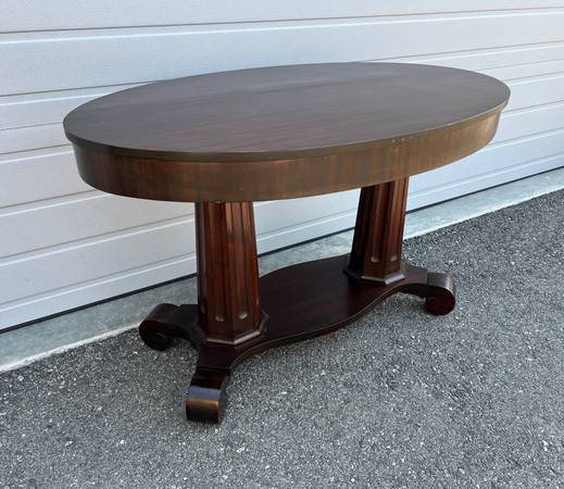 9-10) Vintage Empire Style Oval Mahogany Double Pedestal Library Table with Drawer and Carved Detail (SKU# CB4/1235): Very sturdy and in nice condition, with scratches that have been polished and treated. Multipurpose table . . . unique size! Could be used in an office, conference room, entryway, lobby, etc. 48" long x 28" wide x 30" tall. Was $265 . . . REDUCED to $198!
