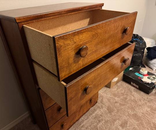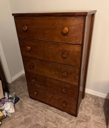 1-3) LIKE NEW 5-Drawer Wood and Pressboard Vertical Dresser with Round Knobs: Drawers are deep and work well. Well cared for and from a nonsmoking home. 26.5" wide x 14.5" deep x 41" tall. $135