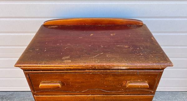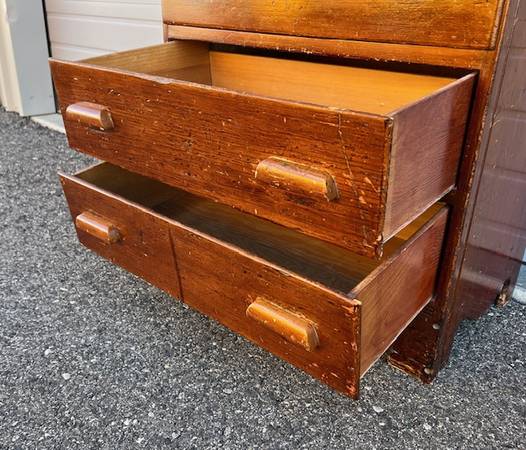4-7) Four-Drawer Solid Wood Vertical Dresser with Rectangular Drawer Pulls (SKU# CB5/1444): Sturdy and in good condition with wear to the finish. Drawers work well. Refinish or paint it to match your decor! 31.5" wide x 18.5" deep x 42" dresser height and 44" height including top edging. $135