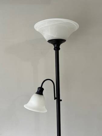 20-21) LIKE NEW Black Steel Torchiere/Reading Floor Lamp with White Glass Shades: Beautiful piece! $50