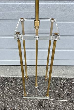 13-14) LIKE NEW Rembrandt Mid-Century Brass Lamp Table with Light Brown Stiff Pleated Shade and Round Glass Shelf (SKU# CB5/198): Exceptional piece! Please note that the lighting when this photo was taken gives the lamp shade a pink color, but it's actually light brown. 17" in diameter x 22" table height and 58" overall height. Was $150 . . . REDUCED to $125!