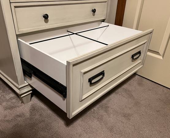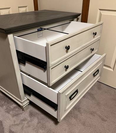 Harrison Modern Gray and White 2-Drawer Lateral File Cabinet: Lightly used for 2 years, sturdy, and in excellent condition! Made of solid wood and veneers. Drawers are on glides, slide smoothly, and include steel bars for hanging files. 36" long x 21" deep x 31" tall. $395