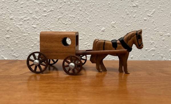 24) LIKE NEW Handcrafted Wooden Horse Drawn Amish Buggy Statue, Made in Lancaster County, PA (SKU# CB5/1252): 6.25" long x 2.25" deep x 2.5" tall. $20