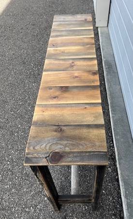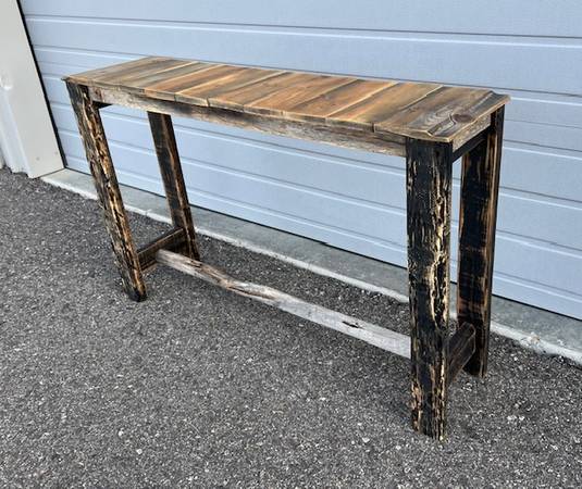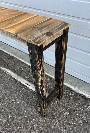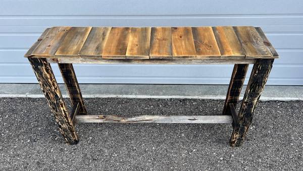 21-24) BRAND NEW Reclaimed Barnwood and Cedar Console Table with Live Edge Cross Support Piece (SKU# CB5/1499): Built by Remarkable Results in Bozeman. Quality craftsmanship! 52" long x 12" deep x 32.5" tall. $250