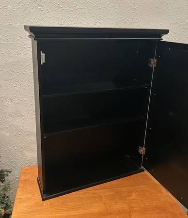 1-2) Black Medicine Cabinet with Beveled Glass Mirror and Shelves (SKU# CB4/695): Great condition! Dimensions will be posted soon. $65