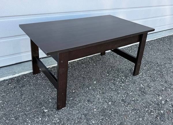 9) Espresso Pressboard Coffee Table (SKU# CB5/679): Sturdy and in nice condition, with some scratches that were touched up with a furniture marker. 32" long x 19.5" deep x 16" tall. $45