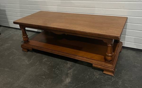 6-8) Antique Solid Wood 2-Level Coffee Table with Decorative Edging by Tell City Furniture (SKU# CB5/1230): Quality piece, sturdy and in great condition! Coffee table has a laminate top. Dimensions will be posted soon. $125