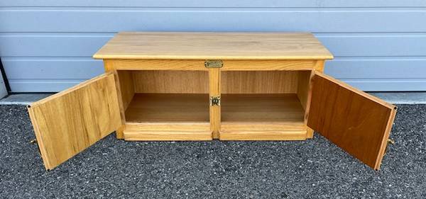 10-12) LIKE NEW High End Solid Oak White Clad Storage Coffee Table: Collectible piece that has been well taken care of! Doors and handles work well. Spacious interior for storage! 44" long x 19" deep x 18" tall. $275