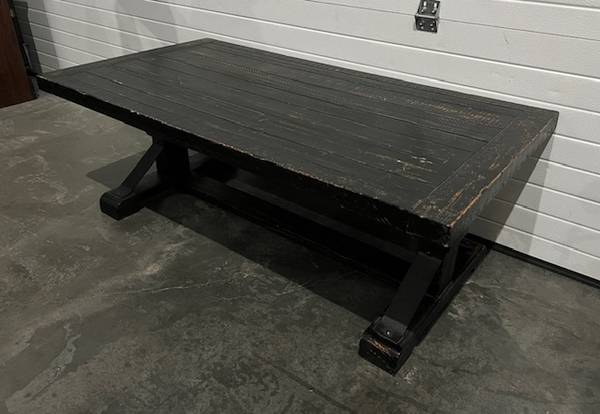 1) BRAND NEW Rustic Wooden 2-Level Wooden Coffee Table with Black Steel Base and X Design (SKU# CB5/811): 48" long x 24" deep x 18" tall. Taken out of box and assembled, never used. (These cost $266.42 new.) $165 (Matching end table also available.)
