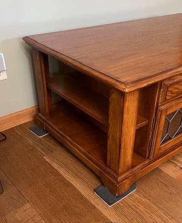 18-22) High End Rustic Solid Oak Lift Top Coffee Table from Conlins with Side Shelves and Divided Glass Doors (SKU# CB5/830): Sturdy and in excellent condition! Doors work well and close securely. Top extends forward on hinges - could be used in front of a couch for writing or eating. 48" long x 28" deep. $350