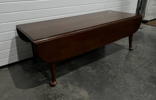 15-17) Long Dark Walnut Ethan Allen Drop Leaf Coffee Table (SKU# CB4/591): Sturdy, high end piece in overall great condition, with 2 white blemishes. Dimensions will be posted soon. Was $135 . . . REDUCED to $98!