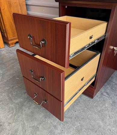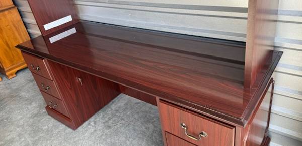 9-14) Four-Drawer HON LOCKING Executive Office Desk with 2 File Drawers, Cherry Finish and Hutch with Cabinets (SKU# CB5/436): Sturdy and in excellent condition! Drawers work well and are set up for hanging files. Keys included. 72" long x 24" deep x 30" desk height and 67" overall height, including hutch. Was $250 . . . REDUCED to $98!