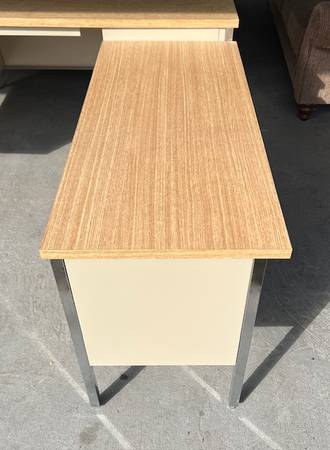 1-8) HON 5-Drawer Steel L-Shaped Office Desk with 2 File Drawers and Commercial Grade Pressboard Top (SKU# CB5/1283): Sturdy and in excellent condition! Drawers work well. Steel file folder frames for hanging files are included for both file drawers (not shown in pictures). Key not included, but both drawers on left side lock, and a key could be made using code on lock cylinder. Main section of the desk is 60" long x 30" deep x 29.5" tall. Return is 40" long x 18.5" deep x 26.5" tall. There are 70" from back corner to end of return. Was $235 . . . REDUCED to $198!