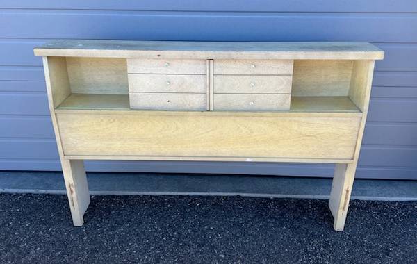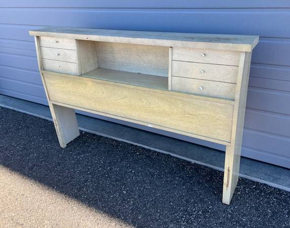 1-3) Full or Queen Size Blonde Oak Headboard Bookcase with Sliding Doors (SKU# CB5/1446): Sturdy and in good condition, with wear on top surface. Doors slide smoothly. There is one small knob missing on sliding door. Please note that since this is a free standing headboard, it could be used with a full or queen size bed, since a queen mattress is 60" wide, and the mattress would only extend 1.25" beyond the headboard on each side. 57.5" long x 8.5" deep x 37.5" tall. $50