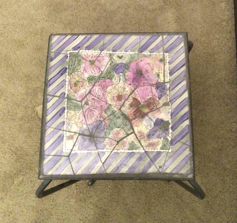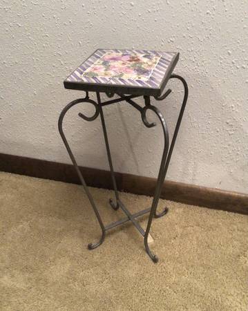 13-14) Wrought iron plant stand with purple and green pastel floral tile top, sturdy and in great condition! (SKU# CB2/1604) 10.5” in diameter at its widest point x 21.5” tall. Square tile top is 8.5” in diameter. $30