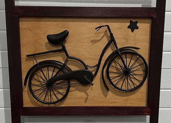 18-19) Unique Dark Brown Antique Solid Wood Planter Box with Antique Bicycle (SKU# CB5/377): Unique piece in great condition! A small repair was made to the top left corner, which was touched up and isn't noticeable. 22" wide x 6.5" deep x 35" tall. $90
