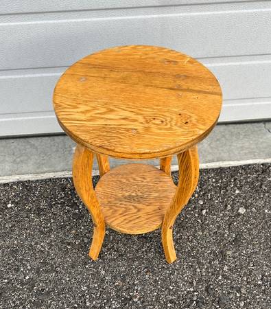 1-2) Small Round Antique Solid Oak 2-Level Plant Stand with Curved Legs (SKU# CB5/1497): Sturdy and in good condition, with a little bit of wear. 12" in diameter x 18" tall. $55