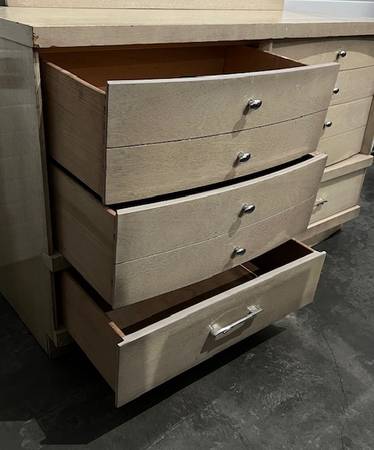 17-20) Nine-Drawer Queen Anne Horizontal Dresser with Deep Lower Drawers: Sturdy and in excellent condition, with a little bit of wear. MDF construction. Drawers work well. 60" long x 16.5" deep x 32" tall. $250