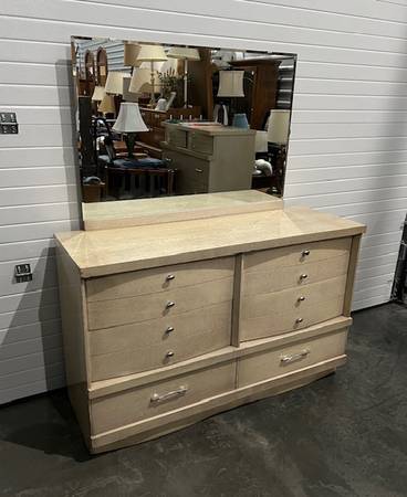 1-5) Bassett Furniture 6-Drawer Blonde Oak Mid-Century Dresser with Beveled Mirror (SKU# CB5/1441): Quality dresser with heavy duty dovetailed drawers. Drawers work well. Brand is United Furniture Corporation. 52" long x 18" deep x 32" dresser height and 61.5" tall, including mirror. $275