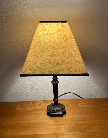 15) Dark Brown Table Lamp with Angled 2-Toned Shade (SKU# CB5/1208): Excellent condition! 17" tall. $22