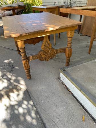 Small oak table I used as a desk. It has one raw/broken edge that I pushed up against the wall.