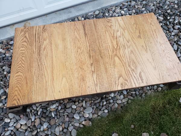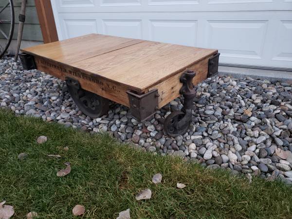 Coffee table with oak top built on vintage rolling furniture factory dolly from the southeast. Very unique and certainly a one of a kind. 27" x 48" $400 obo