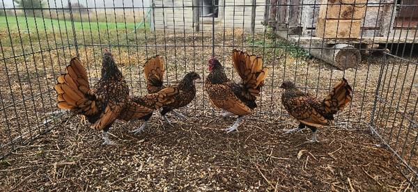 We have 2 roosters and 3 hen Golden Sebright Chickens for sale. They are from a 2025 hatch, These Sebrights ae true bantams, are a bit flighty but very fun to watch. Asking $30 for all five chickens.