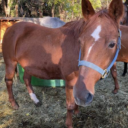 Offered together or separately: 19 y.o. registered chestnut Quarter Horse mare in foal (bred to a fancy registered bay Arabian) and her yearling colt (gelding) from the same pairing with the Arabian sire.
