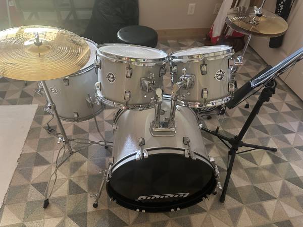 About 3 years old and little used. Includes stool, music stand, and various kinds of sticks. Everything was about $950 new.