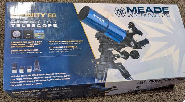 This Meade Infinity 80 refractor telescope is new in the box. I've taken the lid off the box, but everything inside is untouched. It would make a great gift for someone interested in amateur astronomy or astrophotography.