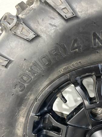 Set of four Polaris 4/156 bolt pattern wheels and new 8 ply 30x10x14 GBC Grim Reaper tires. Tires have maybe 200 miles on them and still look new.